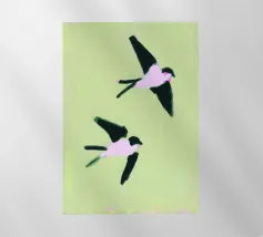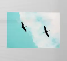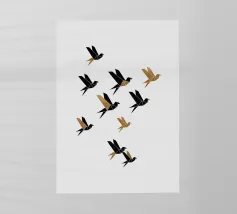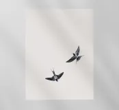 Dit minimalistische ontwerp toont twee zwaluwen die sierlijk door de lucht glijden. De zwart-witte illustratie en de eenvoudige, heldere achtergrond geven het motief een tijdloze en elegante uitstraling. Dit ontwerp is perfect voor liefhebbers van natuurmotieven en minimalistische kunst en brengt rust en lichtheid in elke kamer. Of het nu als muurschildering, kussen of mok is, dit motief is een stijlvol en modern accent voor elk huis en past bij verschillende interieurstijlen.