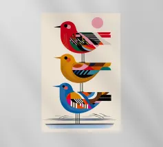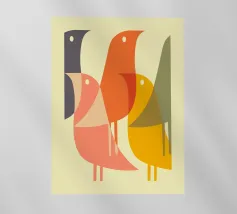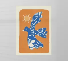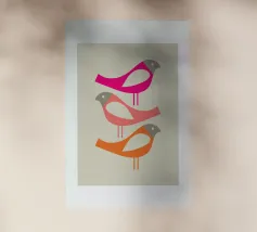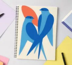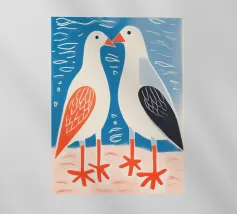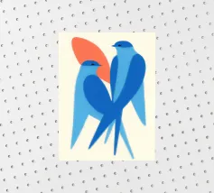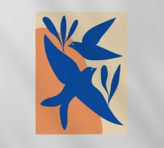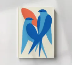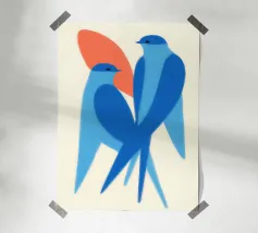 Dit werk viert de elegantie van eenvoud. Twee zwaluwen, gestileerd tot sierlijke, bijna abstracte vormen, domineren de compositie. De zwaluwen zijn geschilderd in een rustgevend palet van licht- en donkerblauw en hun oppervlak wordt gekenmerkt door een zachte, schilderachtige textuur. De stijl doet denken aan de tweedimensionale esthetiek van de Art Deco en de minimalistische designtaal van het Scandinavisch modernisme. De lichte, neutrale witte achtergrond laat de vogels en de krachtige, koraalrode ellips erachter visueel vibreren. Een lyrische variatie op liefde en genegenheid.