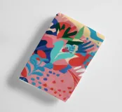 Een abstract, levendig kustlandschap waar de zee een werveling is van blauwe, roze en oranje golven die tegen een kust vol gestileerd, kleurrijk gebladerte slaan.