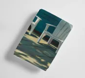 Twee witte adirondackstoelen staan in een zonnige tuin en werpen lange, donkere schaduwen. De compositie is een eenvoudige maar krachtige studie van de zomer, ontspanning, licht en schaduw.