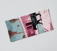A nostalgic Palm Springs scene: a pink flamingo swim ring drifting in a turquoise pool, framed by soft pastel loungers and towering palms. This artwork brings retro summer spirit, relaxed vacation mood, and mid-century charm to any wall — ideal for living rooms, bedrooms, or stylish poolside decor.