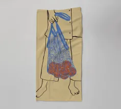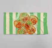 Een levendig en eigenzinnig stilleven met sappige kaki's in een mintkleurige zak van gaas, tegen vintage-geïnspireerde groene strepen. Deze gedurfde pop-art geeft een frisse draai aan de keukenmuren, galeriehoekjes of je favoriete knusse hoekje. Een heerlijke knipoog naar slow living en retro charme.