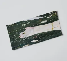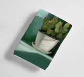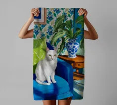 Een vredige witte kat zit op een zonovergoten vensterbank en kijkt naar vlinders die fladderen boven een bloeiende cactus. Zachte schaduwen en groene tinten creëren een rustige, dromerige sfeer - perfect om rust en warmte toe te voegen aan elke ruimte.