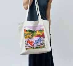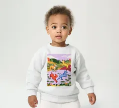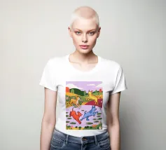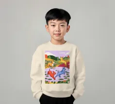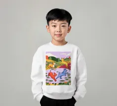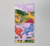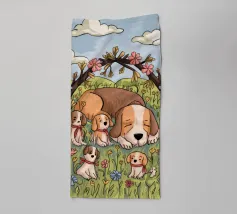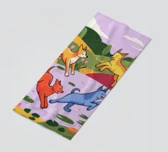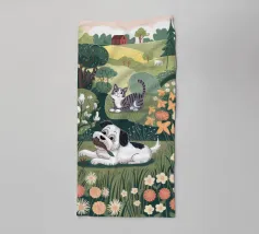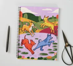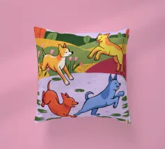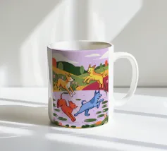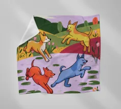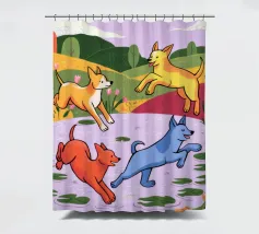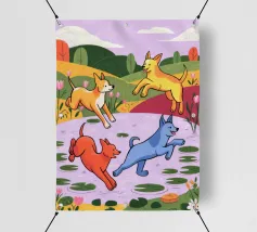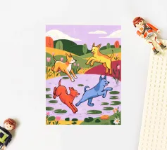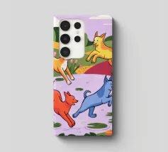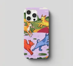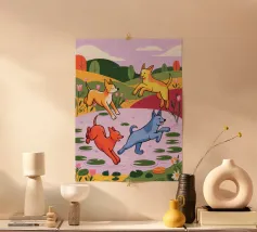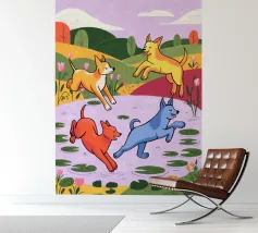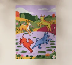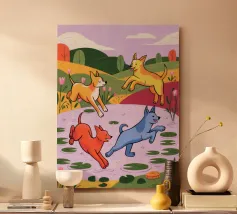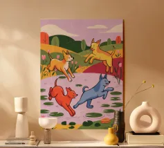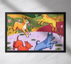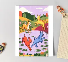 Honden en katten spelen en achtervolgen elkaar in een weiland. De levendige kleuren en dynamische poses geven een gevoel van plezier en energie.