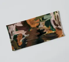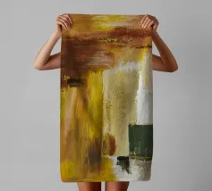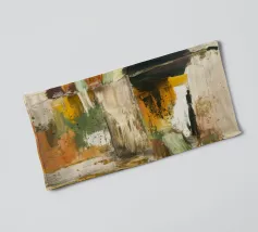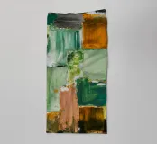 Een abstract kunstwerk met een rustgevende opstelling van vierkante en rechthoekige vlekken in verschillende tinten groen, bruin en beige, die doen denken aan een sereen patchworkveld of een rustig oppervlak met textuur. Bob Nugent-stijl.