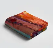 Diep violette en paarse schaduwen vullen een dramatische canyon van rode rotsen. De felle, contrasterende kleuren vangen het intense licht en de stemming van het woestijnlandschap in een moderne, expressieve stijl.