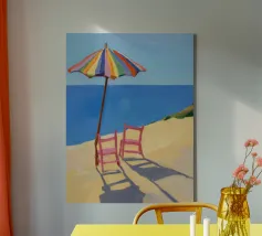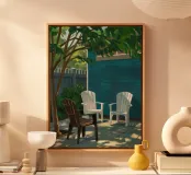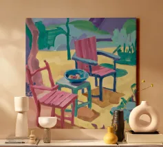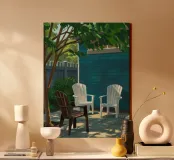 Twee witte adirondackstoelen staan in een zonnige tuin en werpen lange, donkere schaduwen. De compositie is een eenvoudige maar krachtige studie van de zomer, ontspanning, licht en schaduw.