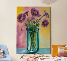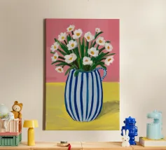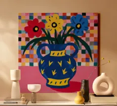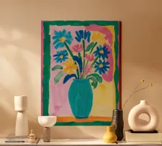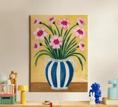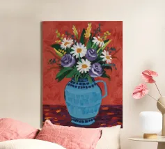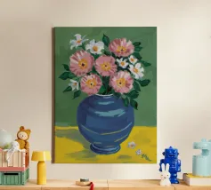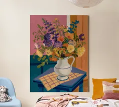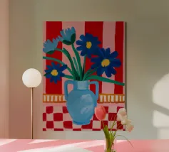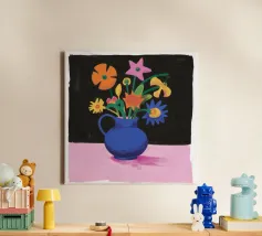 Een levendige reeks kleurrijke wilde bloemen in een opvallende blauwe vaas. De achtergrond is roze met textuur en patronen, waardoor een rijke en vrolijke compositie vol leven en kleur ontstaat.