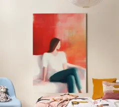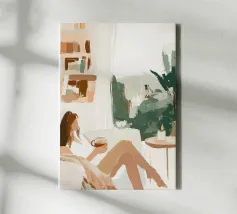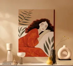 Een minimalistisch portret dat een rustig moment van aanwezigheid en innerlijke rust vastlegt. Zachte penseelstreken, warme terracotta tinten en zachte contrasten omlijsten een figuur in rust, met gesloten ogen in stilte. Dit kunstwerk roept kalmte, zelfbeheersing en de schoonheid van gewoon zijn op. Een verfijnd, emotioneel gefundeerd stuk voor moderne, Scandinavische of serene hedendaagse interieurs.