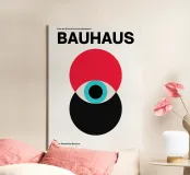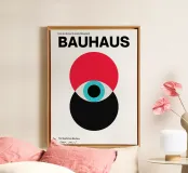 Een iconisch Bauhaus-ontwerp met geometrische cirkels in rood, zwart en blauw, geïnspireerd op de legendarische Staatliche Bauhaus-school. Abstracte vormen, strakke lijnen en een minimalistische stijl maken deze poster tot een tijdloze klassieker van moderne kunst. Perfect voor liefhebbers van Bauhaus graphics, geometrische kunst en retro posters. Ideaal als Bauhaus poster, abstracte muurschildering, mid-century moderne print, retro kunst, moderne design poster, woonaccessoire en cadeau-idee voor designliefhebbers.