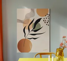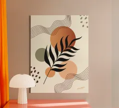 Gestileerde bladeren in zwart en groen tegen een achtergrond van vloeiende, gebogen strepen in zachte aardetinten. Het ontwerp combineert botanische elementen met abstracte geometrische vormen voor een moderne look.