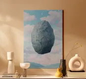 René Magritte's Het kasteel van de Pyreneeën (1959) toont een massief rotsblok dat zweeft boven een verstild landschap, bekroond door een eenzaam kasteel. De surrealistische compositie mengt realistische details met een onmogelijk scenario en roept verwondering, mysterie en dromerige contemplatie op. De dramatische maar toch serene sfeer maakt het perfect voor woonkamers, kantoren of creatieve ruimtes, en voegt een opvallend middelpunt toe dat verbeelding en gesprek aanwakkert.