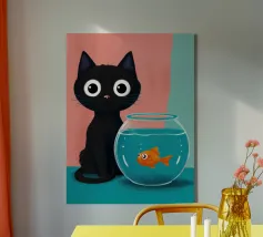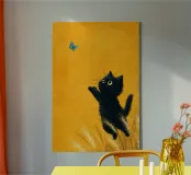 Een stil moment van verwondering gevangen in beweging. Chasing Light toont een klein zwart katje dat tussen hemel en aarde zweeft en naar een vluchtige blauwe vlinder reikt. Tegen een warme, gouden achtergrond roept het tafereel onschuld, nieuwsgierigheid en het universele verlangen op om iets aan te raken dat net buiten bereik ligt. De getextureerde penseelvoering en het zachte contrast tussen donker bont en stralend licht creëren een gevoel van zachtheid en emotionele warmte. Dit kunstwerk balanceert speelsheid met poëtische stilte, waardoor het een charmant en bedachtzaam stuk is dat uitnodigt tot reflectie en vreugde.