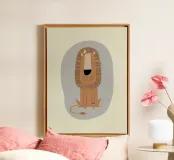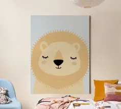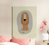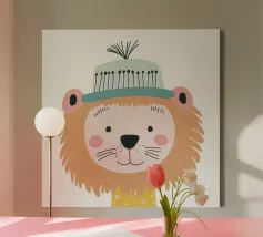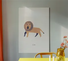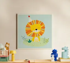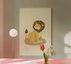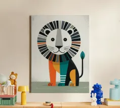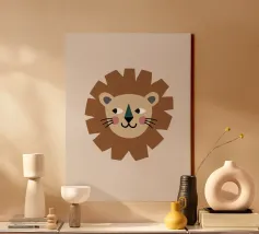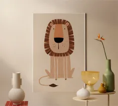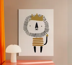 Deze charmante minimalistische illustratie toont een kalme leeuw met een kleine kroon en kleurrijke manen, die warmte en rustig vertrouwen uitstraalt. Met zijn eenvoudige lijnen en moderne kleurenpalet geeft het kunstwerk de zachte kracht van de koning van de jungle weer - perfect voor kinderkamers of vrolijke hedendaagse interieurs.