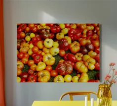 Kleurrijke selectie van tomatensoorten in verschillende vormen en kleuren, gerangschikt op een donkerblauw bord. De versheid en variëteit van tomaten in een heldere, zomerse scène met een mintgroene houten achtergrond.