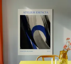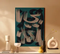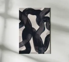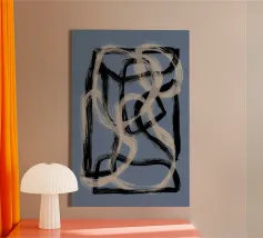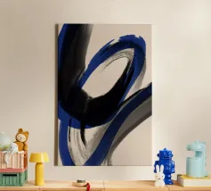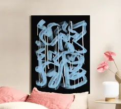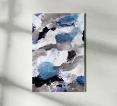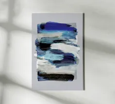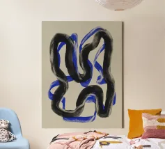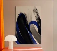 Vette, in elkaar grijpende streken blauw, wit en zwart creëren een abstracte compositie tegen een neutrale achtergrond. De overlappende vormen en dynamische lijnen geven een gevoel van beweging en energie.