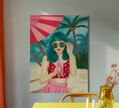 This artwork depicts a person in a vibrant yellow floral top and blue pants, striking a dynamic pose against a pink background with orange floral patterns.