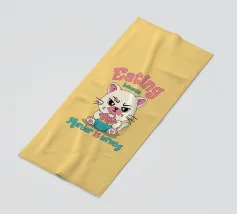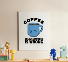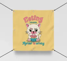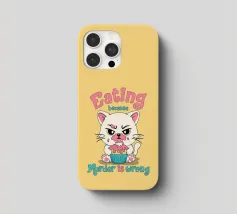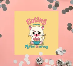 Het kunstwerk toont een schattig katje, maar met een boze uitdrukking en een gezicht besmeurd met glazuur, dat een cupcake verslindt. De zin "Eten omdat moord verkeerd is" creëert een speels contrast tussen schattigheid en donkere humor. Perfect voor liefhebbers van katten, sarcasme en prints vol persoonlijkheid.