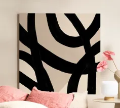 Een opvallend abstract kunstwerk bestaande uit overlappende organische vormen en ritmische lijnpatronen. Het is geschilderd in diepe monochromen met subtiele toonvariaties en brengt structuur en vloeiendheid in evenwicht. De minimalistische benadering en handgetekende texturen creëren een geraffineerde harmonie die zowel modern als tijdloos aanvoelt.