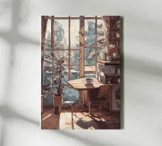Een illustratie van een eettafel met stoelen, met sterke, lange schaduwen vanuit een nabijgelegen raam. De compositie is een stemmige, sfeervolle en artistieke studie van licht en huiselijke ruimte.