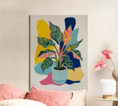 Dit kunstwerk toont een plant met lange groene bladeren en roze bloemen. De achtergrond bestaat uit abstracte vormen in roze en groen, die een vleugje elegantie toevoegen aan het botanische onderwerp.