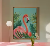 Flamingo staand tussen tropisch gebladerte in een decoratieve set canvas met Baklijst