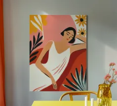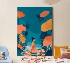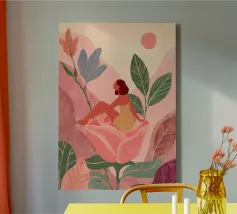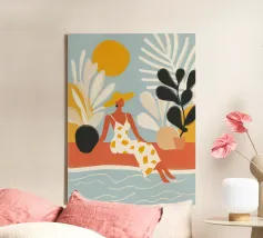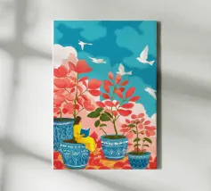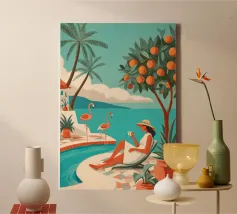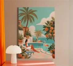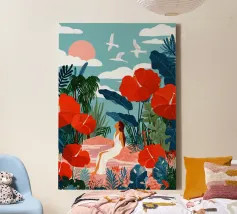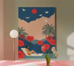 Te midden van torenhoge koraalklaprozen en vederlichte palmen ligt een vrouw vredig onder een felrode zon, drijvend op een poel van stilte. Witte vogels zweven door een dromerige lucht en weerspiegelen de stilte van haar houding. Tegenover rijke indigoblauwe bergen en een mandarijnen lucht legt de scène een surrealistische harmonie vast tussen de natuur en zichzelf - een moment waarop de tijd tot bloei komt en gedachten oplossen in kleur en kalmte.