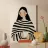 Een mooie, gezellige minimalistische portretillustratie van een vrouw met een witte mok in haar hand, die een rustige, bedachtzame stemming belichaamt. Het figuur wordt gedomineerd door een volumineuze, ontspannen trui met gedurfde, schilderachtige zwarte en witte horizontale strepen, een kenmerk van de Scandinavische esthetiek. Haar opvallende donkere haar en subtiele rode blos vormen een scherp contrast met de monochrome top en het warme terracotta oranje van haar rok/broek. De mok met groene vloeistof voegt een fris kleuraccent toe. Dit kunstwerk combineert prachtig abstracte, figuratieve eenvoud met een troostende, gezellige esthetiek. De hoogwaardige digitale fi