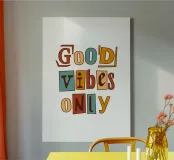 Geef je huis een positief, vintage gevoel met deze "GOOD VIBES ONLY" poster. De motiverende zin wordt gepresenteerd in een leuke, uitgesneden typografische stijl met elke letter creatief geplaatst binnen en buiten kleurrijke blokken. Het retro 70s kleurenpalet bevat rijke aardetinten zoals verbrand oranje, mosterdgeel en gedempt groenblauw, wat het een nostalgische, groovy esthetiek geeft. Deze digitale poster van hoge kwaliteit wordt geleverd op een verbluffende resolutie van 7000 x 5000 pixels bij 300 dpi, wat zorgt voor een scherpe, gedetailleerde afdruk die perfect is voor een gezellige woonruimte of kantoor.