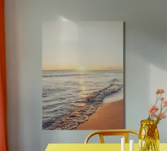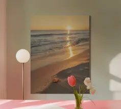 Gouden zonsondergang over rustig strand met zachte golven en zachte canvas