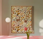 Geniet van de serene schoonheid van dit geschilderde herfstpatroon met herten, kleurrijke bladeren en bessen,