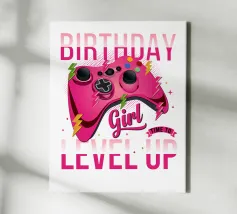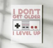 Een retro gamecontroller gaat vergezeld van de zin "Ik word niet ouder, ik stijg op" in een nostalgisch lettertype. Dit ontwerp combineert de vintage spelcultuur met een humoristische kijk op ouder worden.