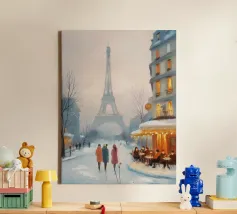 Dit dynamische impressionistische schilderij laat de Eiffeltoren zien die oplicht onder een levendige zonsondergang. Het samenspel van licht en schaduw creëert een verbluffende reeks kleuren, van goudgeel tot diep paars. De getextureerde penseelstreken geven diepte aan de lucht, terwijl de glinsterende weerspiegeling van het kanaal de harmonie van de compositie versterkt. De toren, omlijst door bomen en Parijse straten, blijft het middelpunt en vertegenwoordigt de tijdloze charme van de hoofdstad van Frankrijk.