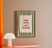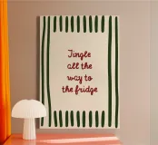 Geef de feestdagen een vleugje humor met deze speelse grafische quote. Het ontwerp bevat de zin "Jingle all the way to the fridge" in een charmant, handgeschreven rood schrift, omlijst door een decoratieve rand van handgetekende groene verticale strepen. Dit gezellige, geestige ontwerp weerspiegelt perfect de nostalgische charme en ongedwongen verwennerij van kerstfeesten. Ideaal voor keukenhanddoeken, kleding of speelse kerstdecoratie. Je superieure digitale kunstwerk wordt geleverd met een uitzonderlijke resolutie van 7000x5000 pixels bij 300 dpi, zodat je verzekerd bent van eersteklas helderheid en grafische natuurgetrouwheid voor drukwerk van hoge kwaliteit.