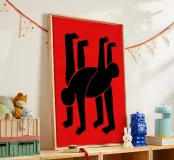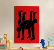 Deze levendige en energieke poster toont twee gestileerde menselijke figuren in dikke, effen zwarte silhouetten tegen een intens monochrome rode achtergrond. De figuren zijn in elkaar verstrengeld in een complexe acrobatische of danshouding, met de ledematen dramatisch naar boven en naar buiten gestrekt, waardoor een dynamische, gespiegelde en bijna symmetrische compositie ontstaat. De minimalistische, krachtige lijnen en het grafische kleurcontrast doen sterk denken aan de esthetiek van Pop Art en straatkunstenaars als Keith Haring. De nadruk ligt op beweging, vorm en pure, directe visuele impact. Dit is een digitale poster van superieure kwaliteit, aangeboden in
