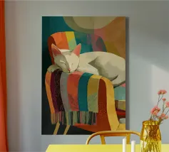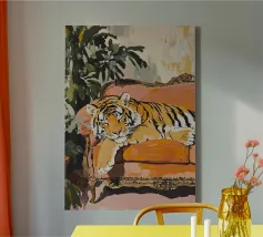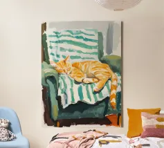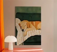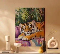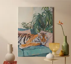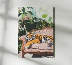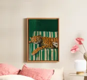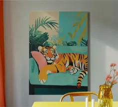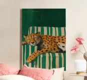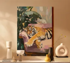Een sereen en grillig kunstwerk van een cheeta die vredig ligt te dutten op een vintage groen-wit gestreepte bank. De gedurfde patronen en knusse houding van de grote kat creëren een dromerig, humoristisch contrast tussen de wilde natuur en het relaxte huiselijke leven. Perfect voor dierenliefhebbers, eclectische kunstverzamelaars en fans van speelse interieurstijlen.
