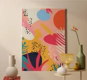 Een levendige mix van abstracte vormen en kleuren, waardoor een dynamische compositie ontstaat.
