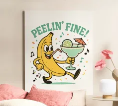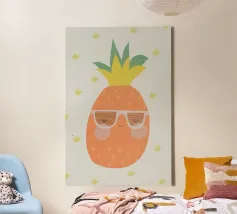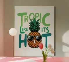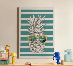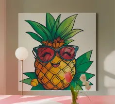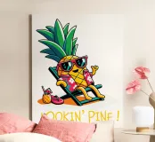 Een ananas in cartoonvorm ontspant op een strandstoel met een zonnebril en een Hawaïaans shirt, wat een relaxte sfeer uitstraalt. Er staat een verfrissend drankje naast, als aanvulling op de humoristische tekst "LOOKIN' PINE!" onder het tafereel.