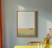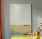 Dit rustige, minimalistische digitale kunstwerk vangt een scène van vredige eenzaamheid. De compositie toont een eenzame visser in een groene boot die over het water glijdt, weergegeven in zachte oranje en perzikkleuren. De voorgrond wordt gedefinieerd door gedetailleerde wilde grassen en oranje bloemen, die een duidelijk contrast vormen met de uitgestrekte, luchtige, gebroken witte achtergrond. Een kleine zwerm rode vogels vliegt door de open lucht en voegt een vleugje leven toe. Deze hoogwaardige digitale poster (7000x5000 pixels, 300 dpi) biedt een rustgevende, Japans geïnspireerde esthetiek die perfect is voor moderne, serene ruimtes.
