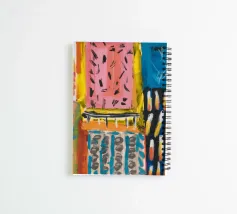 A patchwork of different patterns, including lines and U-shapes, in vibrant yellows, blues, pinks, and reds, creates a colorful mosaic effect in this abstract piece.
