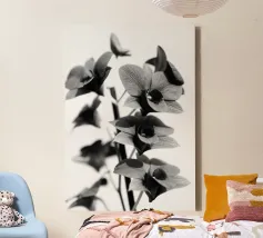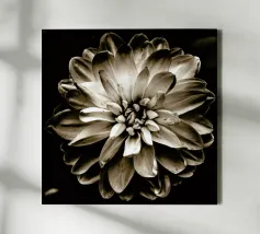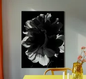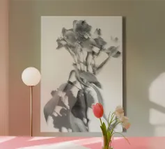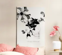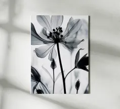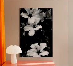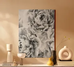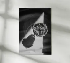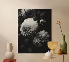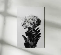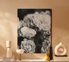 Deze fascinerende monochrome foto speelt meesterlijk met het spel van licht en schaduw en onthult een dramatisch boeket bloemen. Sommige bloemblaadjes baden in schitterend licht, waardoor hun delicate texturen en vormen worden benadrukt, terwijl andere zich terugtrekken in diepe, fluweelachtige duisternis, waardoor een scherp en meeslepend contrast ontstaat. De afwezigheid van kleur accentueert de ingewikkelde details en emotionele diepte van de compositie en nodigt kijkers uit om de subtiele nuances van licht en de diepe schoonheid in de schaduwen te verkennen. Het is een tijdloos werk dat een gevoel van mysterie, elegantie en het epos oproept.