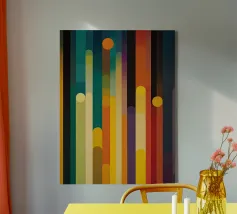 Levendige op-art in heldere streepjescode: Deze krachtige abstracte compositie viert pure kleurenenergie. De verticale banden van rood, turquoise, geel, oranje en donkergroen doen denken aan de optische experimenten van Bridget Riley. De ritmische offset in het midden van het beeld creëert visuele spanning en beweging. De precieze uitvoering en het retro kleurenpalet doen denken aan de designesthetiek van de jaren 1960. Een hypnotiserend spel met perceptie en ritme - hedendaagse abstractie met maximale visuele impact. Perfect voor liefhebbers van geometrische kunst en krachtige kleurencomposities.