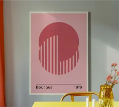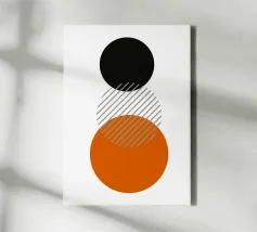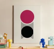 Een opvallende minimalistische abstracte poster met twee gedurfde cirkels verticaal gestapeld op een crèmekleurige gebroken witte achtergrond. De bovenste cirkel is levendig magenta/heet roze en de onderste is effen zwart. Verticale, parallelle zwarte lijnen verbinden en strekken zich uit vanuit de cirkels, waardoor een krachtig gevoel van spanning, balans en visuele structuur ontstaat, dat doet denken aan Bauhaus-principes. Deze hoogwaardige digitale download heeft 7000x5000 pixels bij 300 dpi, wat zorgt voor uitzonderlijke helderheid en superieure afdrukkwaliteit voor een verfijnd kunstwerk op groot formaat.
