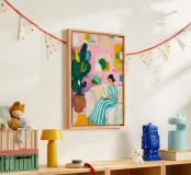 Op deze vrolijke digitale poster zit een vrouw te lezen op een witte bank tegen een achtergrond van levendige roze muren versierd met abstracte kleurblokken. De figuur is gestileerd en draagt een opvallende groen-wit gestreepte jurk. Een grote, donkergroene cactus in een terracotta pot verankert de linkerkant en voegt een vleugje bohemien energie toe. Het kunstwerk is weergegeven in een gedurfde Pop Art-stijl met zware, texturale impasto penseelstreken en viert vrije tijd en kleur. Dit eersteklas digitale kunstbestand (7000x5000 pixels, 300 dpi) biedt superieure artistieke kwaliteit en is een ideaal, maximalistisch statementstuk voor een levendige l