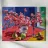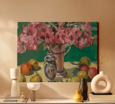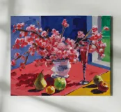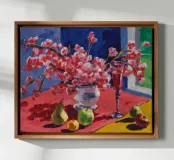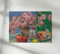 Een gedurfd stilleven met levendige roodroze bloemen, mogelijk klaprozen of geraniums, in een eenvoudige vaas, naast frisgroene peren, alles op een rijk rood tafelkleed dat scherp contrasteert met een diepblauwe achtergrond.