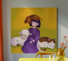 Een kat en een hond liggen in een weiland vol hoog gras en bloemen. De scène is vredig en idyllisch en benadrukt de zachte en rustgevende aard van het moment.