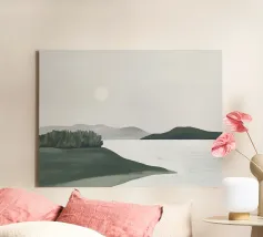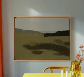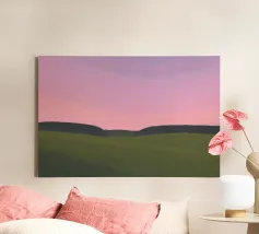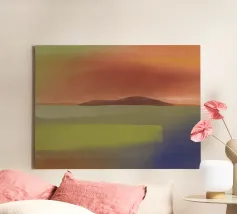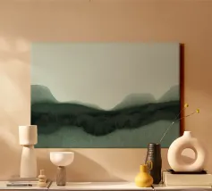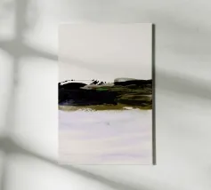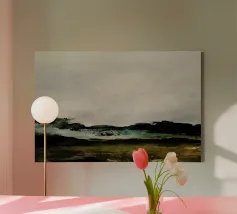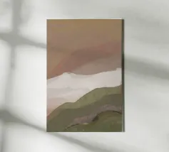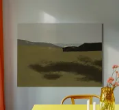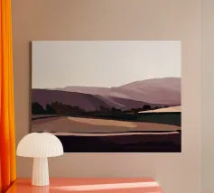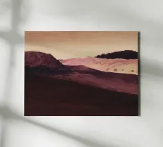 Een sereen landschap met gedempte aardetinten, met een ruig terrein dat zich uitstrekt naar een wazige horizon. Schaduwen en contrasten benadrukken de heuvels in de verte en roepen een gevoel van rust en stilte op.