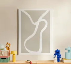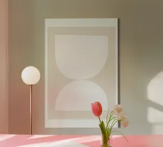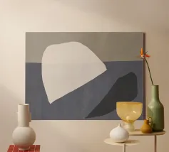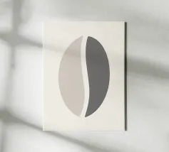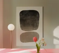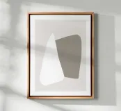 Een rustgevend abstract kunstwerk met twee overlappende organische vormen in warme aardetinten, omlijst door een strakke witte rand. Het zachte ontwerp creëert een gevoel van evenwicht en rust, waardoor het een veelzijdig stuk is voor moderne, Scandinavische of boho-geïnspireerde interieurs.