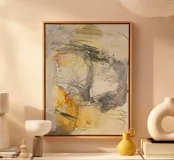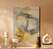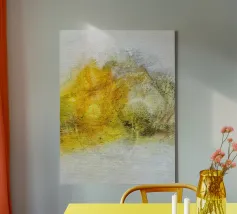 "Somewhere in my memory I" is een emotionele reis door fragmenten van voorbije momenten. Mistige vormen in warm oranje, zacht grijs en lichtgele tinten doordringen het beeld als vervaagde herinneringen. De compositie is als een visueel dagboek - intuïtief, vluchtig, met delicate overlays die doen denken aan vergeelde foto's of droomsequenties.