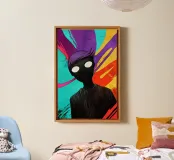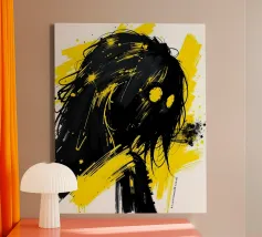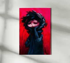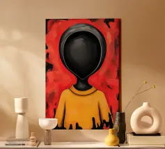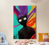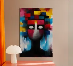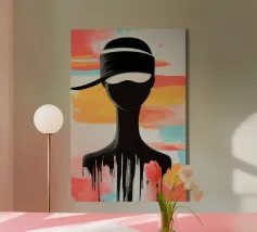 Dit fascinerende kunstwerk combineert duisternis met een levendige kleurexplosie. Een gezichtsloze figuur met lege, witte ogen staat in contrast met een achtergrond vol levendige kleurenstrepen in turquoise, paars, geel en rood. De scherp getrokken lijnen en het matzwarte silhouet creëren een surrealistische spanning - een symbool van identiteit, perceptie en de zoektocht naar het zelf. Een krachtige mix van mystiek, abstractie en modern expressionisme.